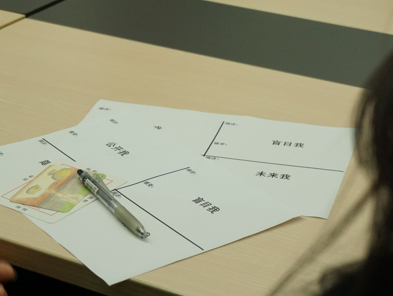 活动总共分为四个环节,同学们需要每轮各抽取一张图卡及一张字卡,并结合主题,分享自身感受。第一环节中,每个人逐一观察不同牌卡,选出两张能够代表自己的牌卡,并依序轮流向大家介绍自己,这不仅让同学们有机会展示自己的个性,也促进了彼此之间的初步了解。第二、三环节中,同学们从隐藏我、盲目我的视角出发,借助牌卡更加深入地探索了自己的内心世界,也对他人眼中的自己有了更全面的认识。第四环节,大家重新抽取牌卡后,依次分享了对于未来自我的憧憬与期待,并许下对于未来成长的美好心愿。