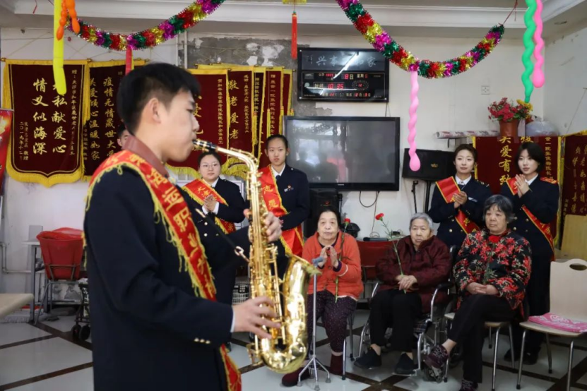 在春意渐浓的养老院活动厅内,由16名师生组成的志愿团队精心筹备了传统文化展演。学子们为长者们呈上融合传统与现代元素的文艺盛宴,首先由张朋同学表演的萨克斯独奏《漫步人生路》一曲结束后,奶奶们意犹未尽,于是张朋同学即兴表演了一首流行曲—《三十八度六》。当然,经典的红歌联唱也引发老人们的情感共鸣,由光雪宇同学领唱的《强军战歌》和《精忠报国》经典红歌让多位长者热泪盈眶。郑奶奶拉着志愿者的手连声说:这些孩子们真贴心,让我们好像回到了年轻时光。