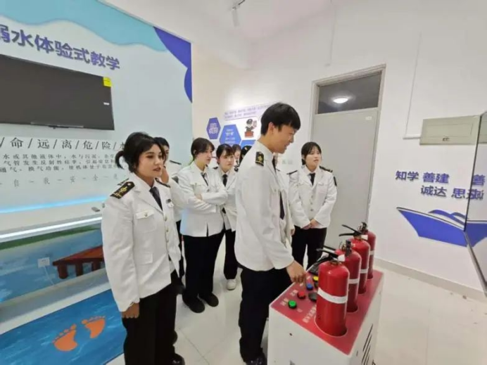 在消防演练区,系统模拟设置了电器短路、宿舍起火等突发场景,老师现场演示灭火器类型选择和使用技巧,学生代表实操体验,掌握“提、拔、握、压”四步法要领,迅速完成灭火任务。