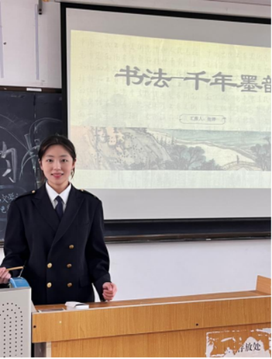 活动伊始,海运文学社干部张婷同学以“研究背景”为切入点,娓娓讲述书法的起源。原始社会陶器、龟甲之上的远古符号,诸如半坡彩陶符号,作为汉字与书法的萌芽,拉开了此次书法文化探寻之旅的序幕。而甲骨文,作为中国书法体系中最早的文字形态,更是让社员们切实感受到书法艺术深厚的历史积淀。