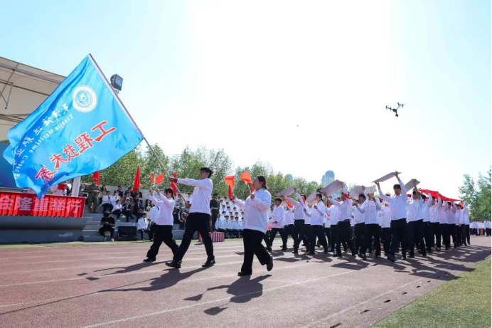 在雄壮嘹亮的乐曲声中,国旗护卫队、院旗院徽方队、旗海方队、各系代表队、留学生方队、分工会教职工代表及裁判员方队依次通过主席台接受检阅,展现出顽强拼搏、奋勇争先的精神风貌,赢得了在场师生的阵阵喝彩。